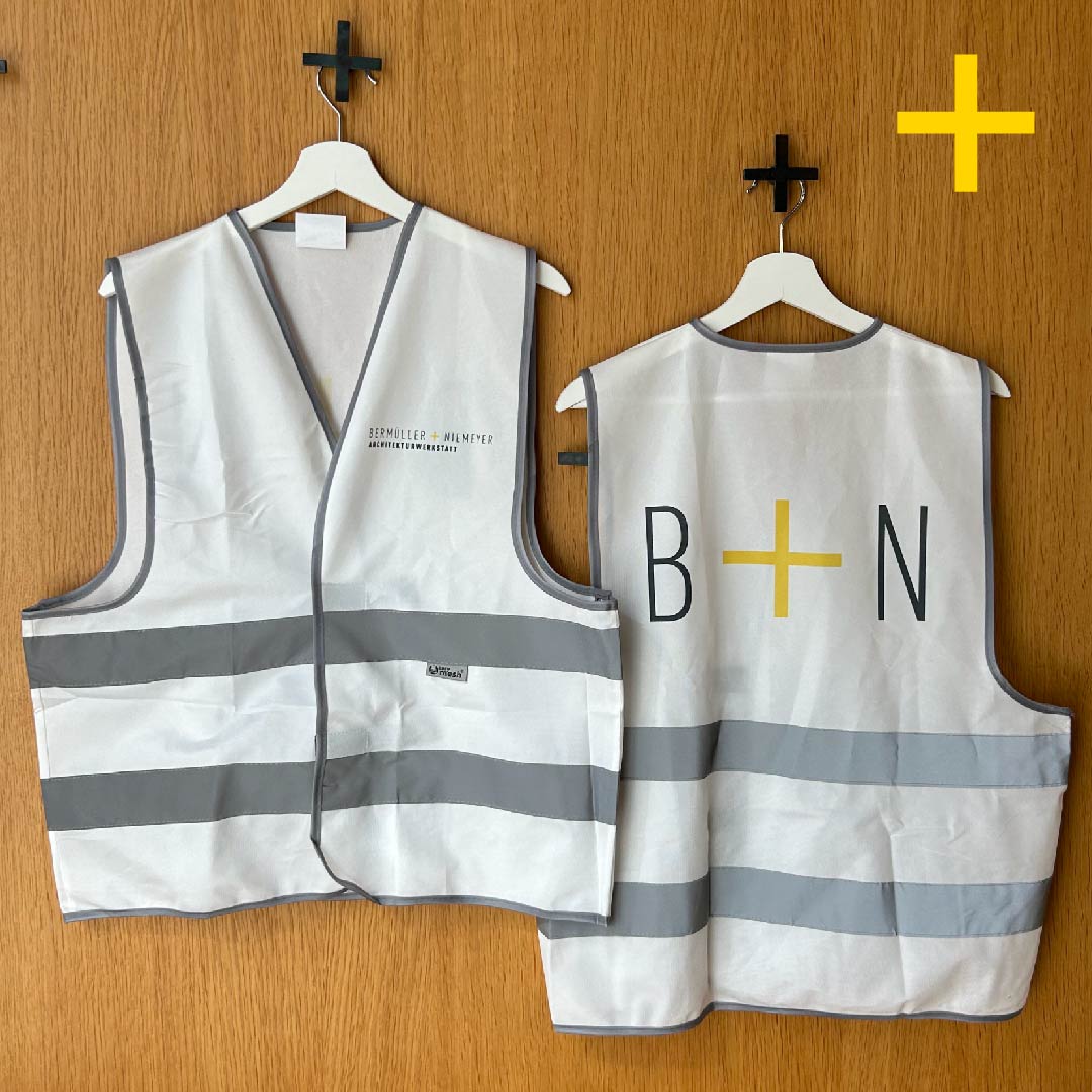 –Unsere Warnwesten für die Baustellen sind da! Auch für Bürohund Charly gilt Vorsicht statt Nachsicht.