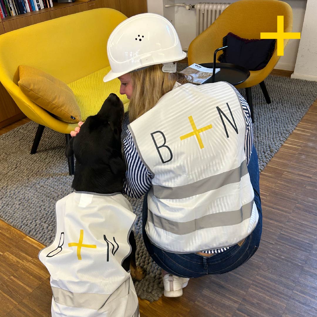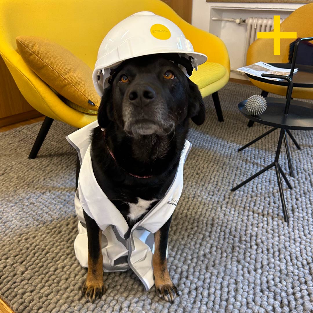 Unsere Warnwesten für die Baustellen sind da! Auch für Bürohund Charly gilt Vorsicht statt Nachsicht.