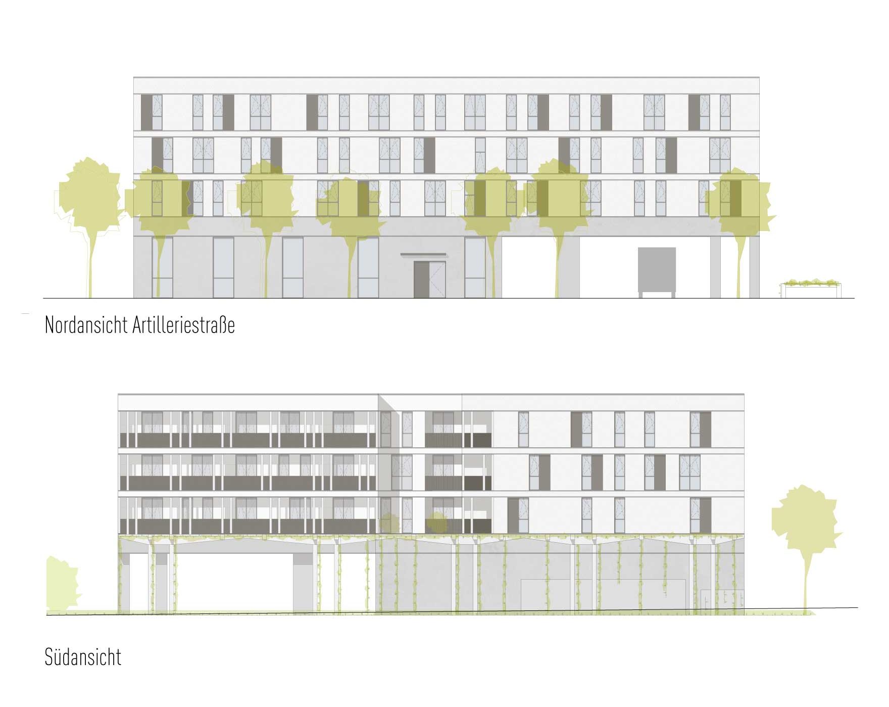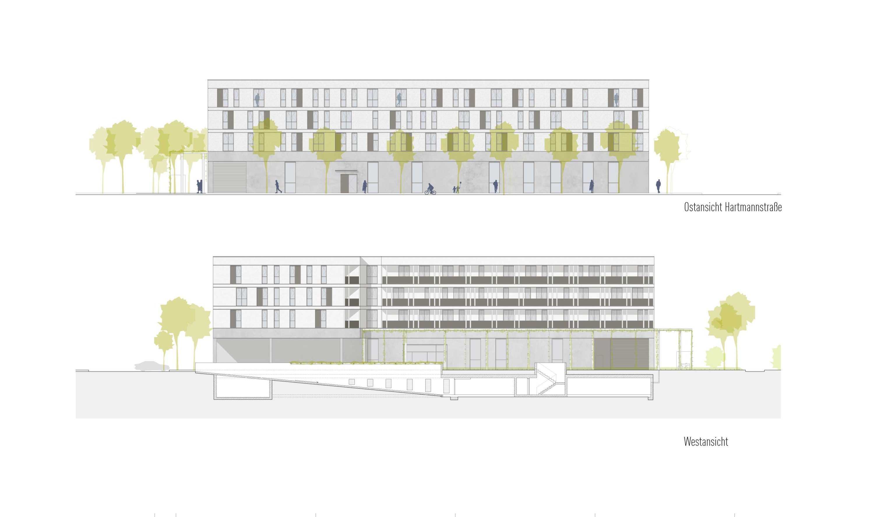 Im Untergeschoss bietet eine Großgarage kompfortable KFZ-Stellplätze für die Bewohner des Hauses. Das Erdgeschoss beherbergt einen Lebensmittel-Einzelhandel mit 1200 m2 Verkaufsfläche, an den ein ebenerdiger Kunden-Parkparkplatz angeschlossen ist. Das Erdgeschoss ist darüberhinaus durchzogen von einer intensiven Begrünung. Die drei Obergeschosse des in Holz-Hybrid-Bauweise ausgeführten Baukörpers bieten Raum für insgesamt 76 Wohneinheiten. Der heterogene Wohnungsmix mit 1-4-Zimmer-Wohnungen schafft ein vielfältiges Angebot für die unterschiedlichsten Wohnmodelle. Der Baubeginn ist für 2023 und die Fertigstellung für 2025 geplant.
